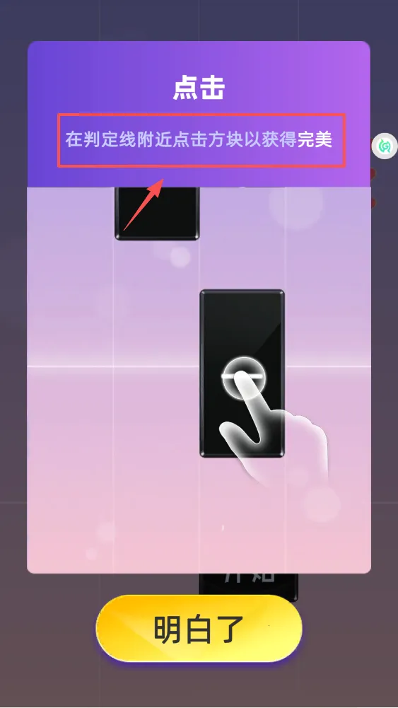 2、游戏遇到下落方块别慌张,看准时机在判定线附近轻点它,跟着节奏操作,多练几次就能掌握手感了。