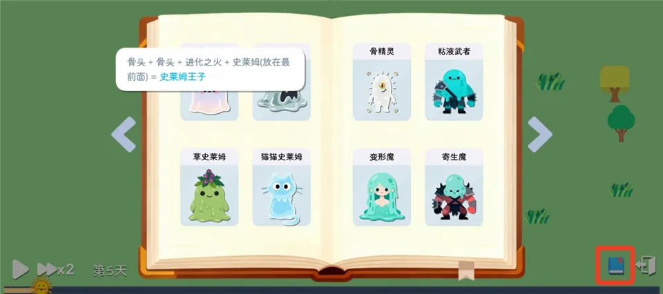 5、点击右下角的书本标识,可以查看不同史莱姆进化所需的卡片。