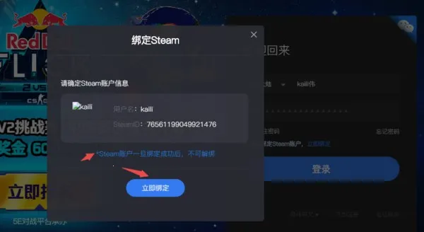 4、在绑定steam窗口中,点击【立即绑定】按钮即可,这里需要注意的是,steam账户一旦绑定成功后,是不可以进行解绑的。