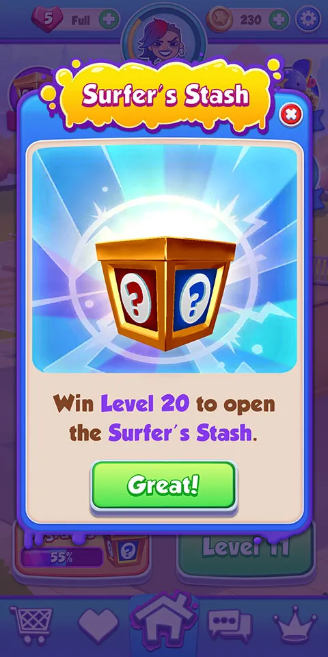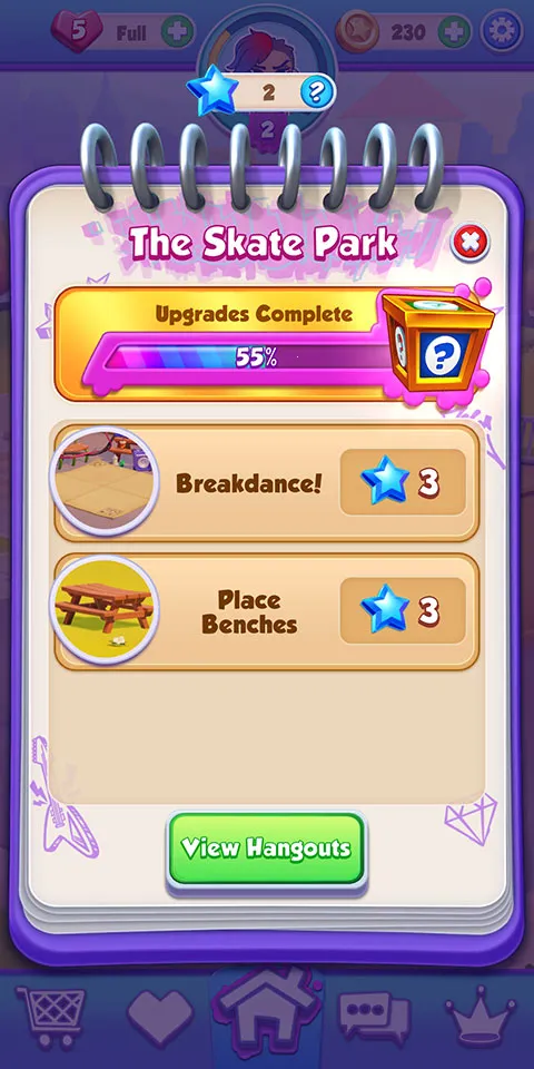2、探索与装饰:加入团队旅程,让休息室变新,扩展滑板天堂运营基地。爆炸消除格子,破解谜题,完成关卡解锁独特物品装饰聚会场所。